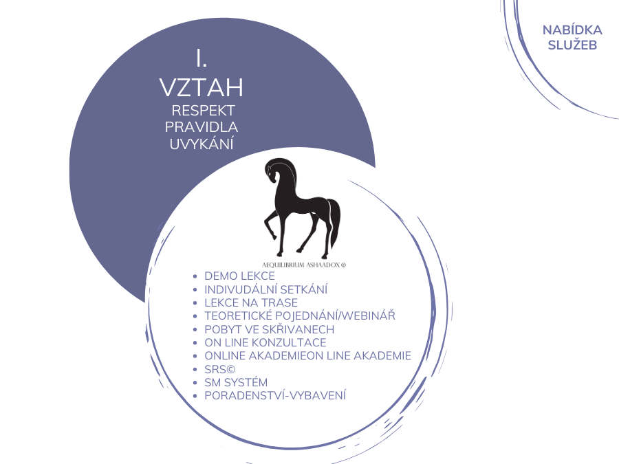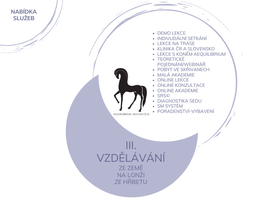 Akademie Aequilibrium Ashaadox zachování dědictví evropského jezdeckého umění Tři kroky na cestě za rovnováhou a harmonií Vztah je prvním krokem na naší cestě Společný jazyk tvoříme, máme-li s koněm vztah – druhý krok Vzdělávání je třetím krokem máme-li vztah a společný jazyk Podrobnější infografika jen pro přihlášené Aktivní studenty.